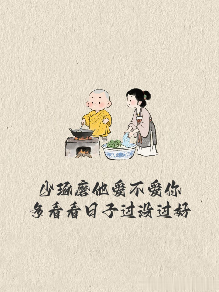 少议论他爱不爱你,多望望日子过没过好。风花雪月是点缀,生老病死才是正餐。孩子健康,我方没病,钱够花,这三样有了,别的齐是字斟句酌。盯着那些细枝小节较劲,就是放着米饭不吃,专挑沙子。