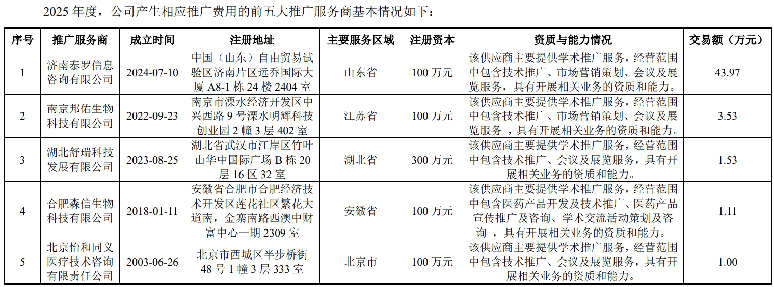 字据最新版招股书,2025年3月至已往底,斯泰度塔单抗打针液实质销售15.9万瓶,实质完结收入5122.49万元,显赫低于该公司初次陈诉IPO时的展望值。对此,泰诺麦博给出的诠释包括原有预估合座过于乐不雅、低估了新药院端准入责任贫苦、外部奉行劳动商发力不及等。《审核问询函的恢复》第138页袒露的“奉行用度的前五大奉行劳动商基本情况”则骄气,5家奉行劳动是注册成本系数也不外才700万元。