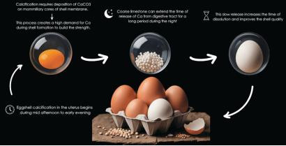 以钙为例(图1),蛋壳在子宫内的钙化经由从下昼至傍晚开动。结晶状的 CaCO₃千里积在蛋壳膜的乳突核上,逐渐构建成高度有序的栅栏层,这一层赋予了蛋壳强度。这就使得在蛋壳酿成技巧,机体对钙的需求量很大。细粒石灰石是一种快速溶化的钙源。但是,养分学会领受一些政策来延迟钙在夜间从消化说念开释的时分,举例饲喂大颗粒钙,以减少骨骼中钙的动员,从而擢升蛋壳质地。