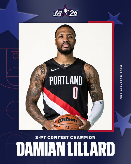 利拉德生活第7次参预三分大赛,第三次夺得三分王,比肩拉里-伯德和霍奇斯比肩成为历史上夺得三分大赛冠军最多的球员。