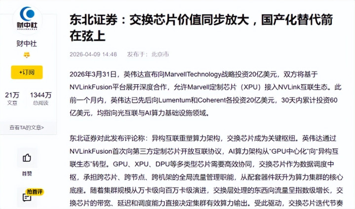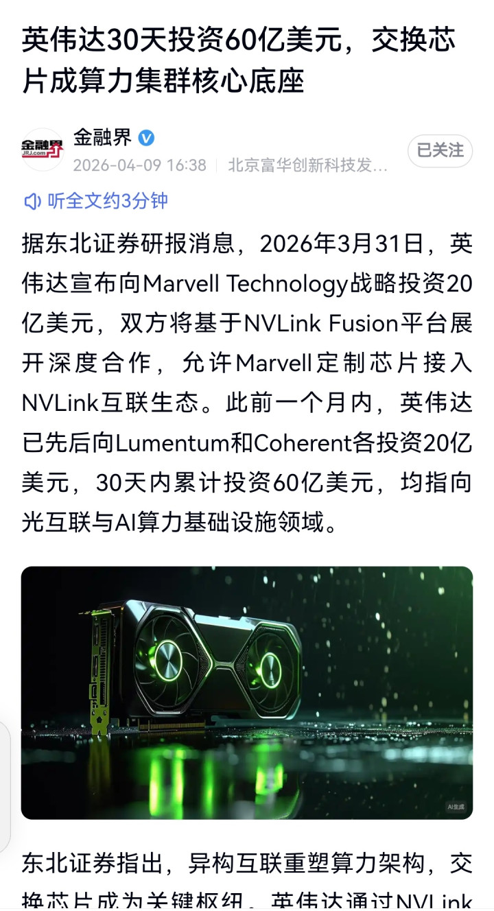 国际方面,英伟达加速构筑互联生态壁垒。 2026年3月31日,英伟达晓谕向Marvell Technology计谋投资20亿好意思元,两边基于NVLink Fusion平台伸开深度合营,允许Marvell定制芯片接入NVLink互联生态。此前一个月内,英伟达已先后向Lumentum和Coherent各投资20亿好意思元,30天内累计投资60亿好意思元,均指向光互联与AI算力基础设施领域。