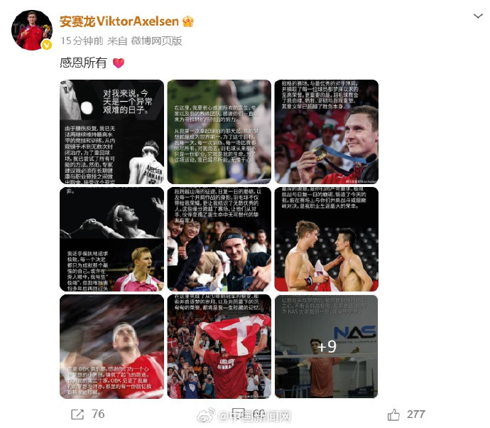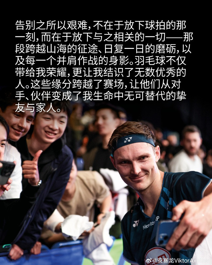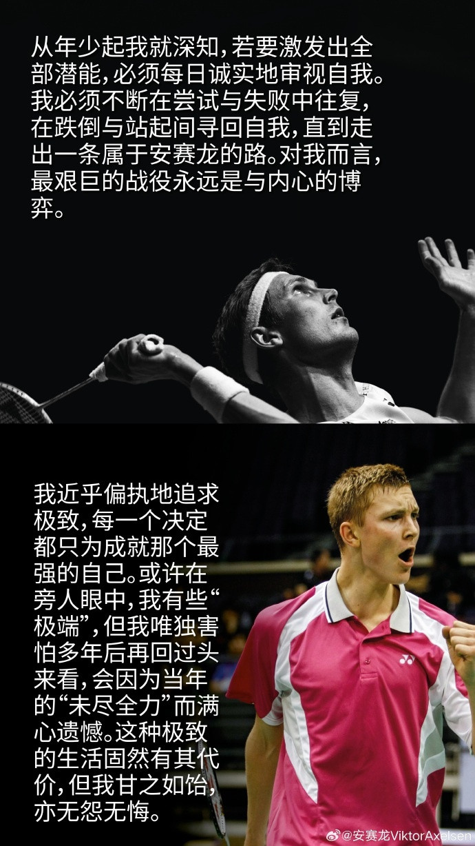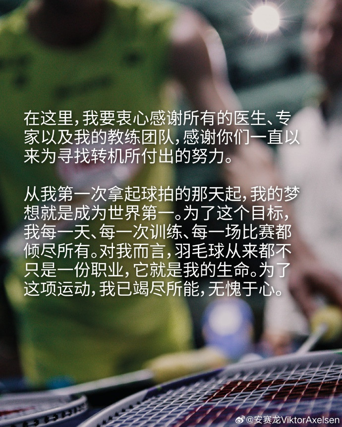 从我第一次提起拍子的那天起,我的梦念念等于成为宇宙第一。为了这个主意,我每一天、每一次历练、每一场比赛皆倾尽统共。对我而言,羽毛球从来皆不仅仅一份劳动,它等于我的生命。为了这项通顺,我已竭尽所能,无愧于心。”