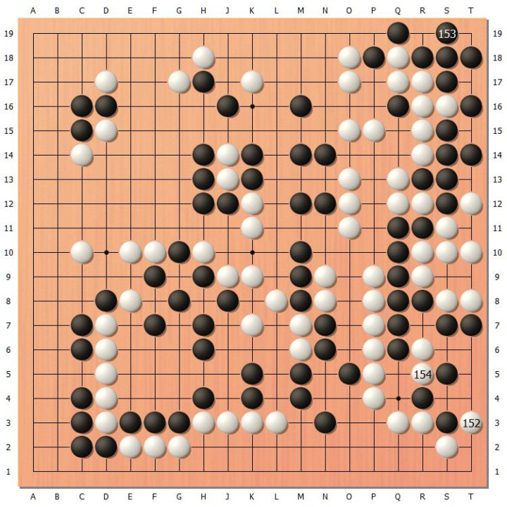 芝野虎丸十段消掉了中央的劫争。一力辽棋圣以白152在角上拐出。芝野虎丸十段以黑153试图在右边的对杀中取胜,但看到白154后手忽然停住,休息室里也传出“诶?”的惊呼。
