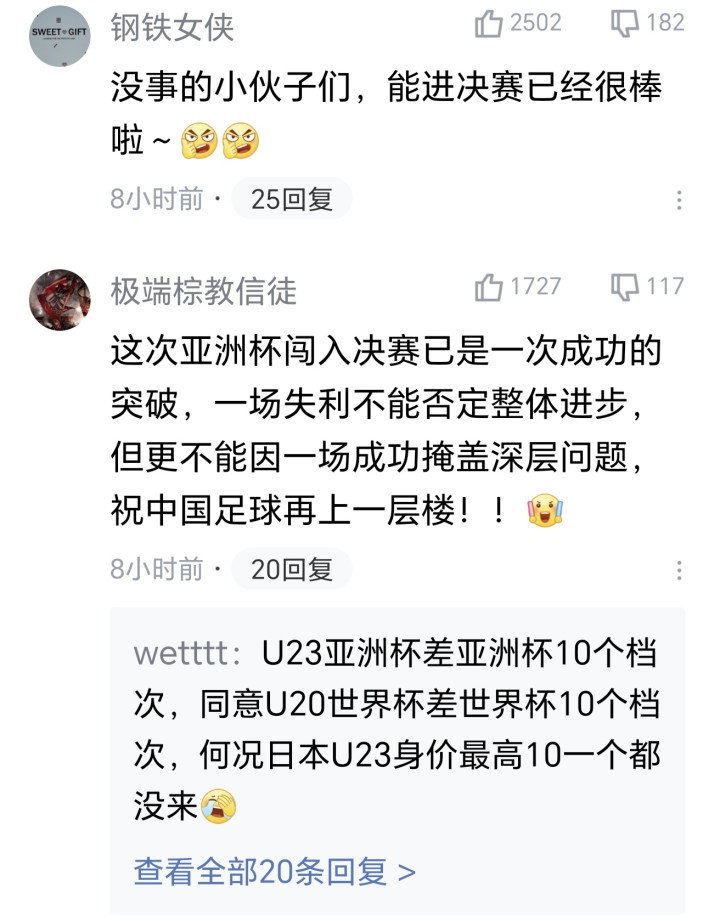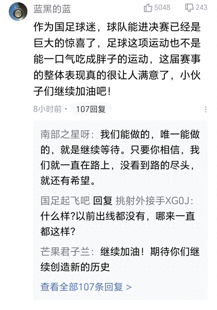 在平日,国足这种大比分惨败一定会在赛后遭到球迷的鸣鼓而攻。可就在这场比赛失利后,球迷们却展现出了前所未有的优容。球迷们暗意,能进决赛还是是惊喜了,这届赛事举座阐扬让东谈主舒坦。