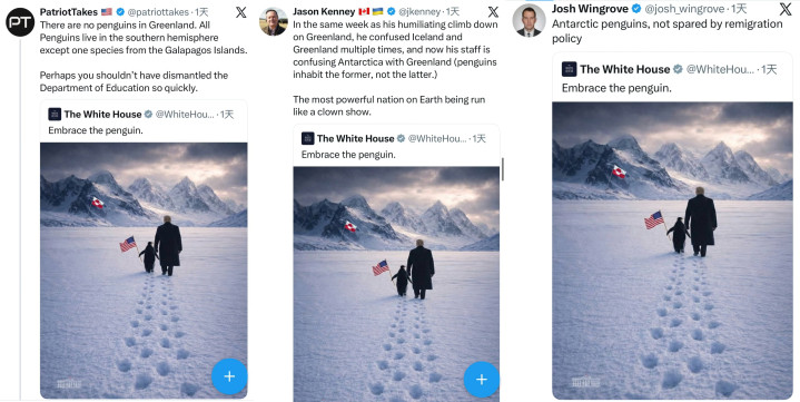 {jz:field.toptypename/}由于格陵兰岛根柢莫得企鹅,这张图片在X上坐窝激励网友嘲讽及二次创作。举例,有网友为纠正图片中知识性极端,将企鹅换成北极熊;还有网友贴出企鹅在环球范畴内的栖息范畴等。