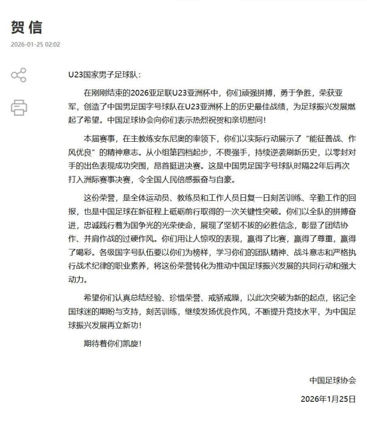 25日凌晨,国度体育总局、中国足球协会辨别向在U23男足亚洲杯决赛中获取亚军的中国队致贺信,饱读舞军队功成弗居、再接再厉,以本次赛事为新的起先和能源,为中国足球振兴发展再立新功。