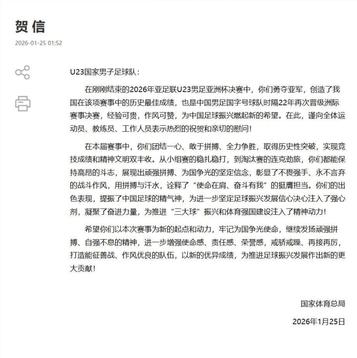 国度体育总局在贺信中示意,U23国足勇夺亚军,创造了我国在该项赛事中的历史最好成绩,亦然中国男足国字号球队时隔22年再次晋级洲际赛事决赛,造就郑重,格调可赞,为中国足球振兴燃起新的但愿。
