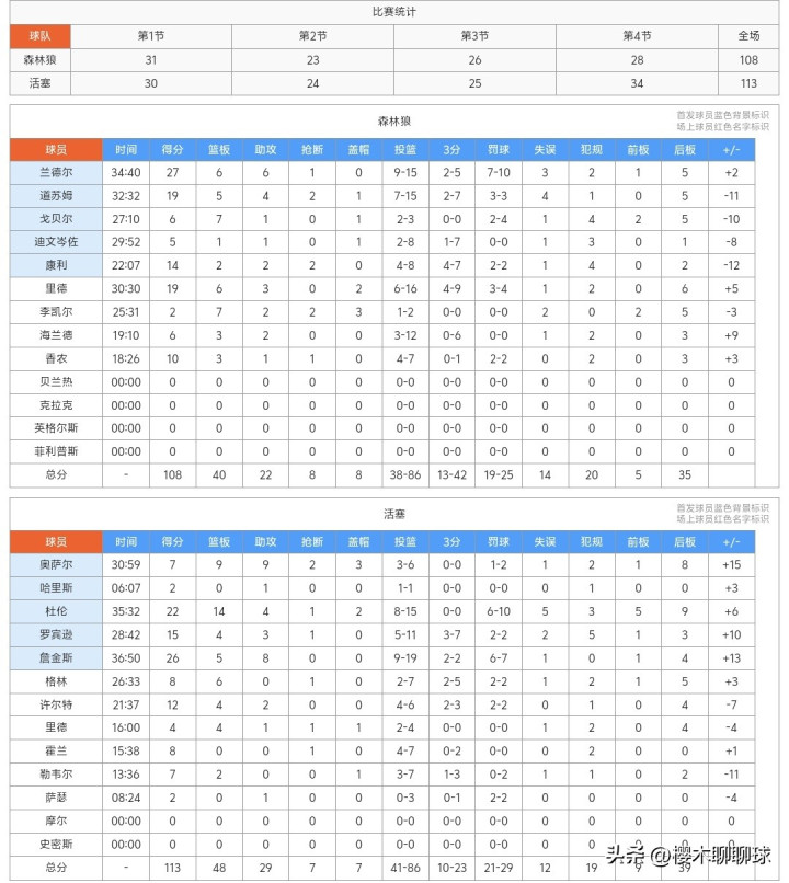 康利半场取得14分1板2助2断、兰德尔12分1板2助、海兰德6分3板2助、香农6分2板1助、谈苏姆6分1板3助、里德4分3板1助、戈贝尔2分4板、李凯尔2分2板、迪文岑佐2分1板。下半场第三节易边再战,替补席的里德推崇很出色,兰德尔引颈多东谈主推崇,不度日塞队亦然莫得掉队,比赛荒谬的胶著,三节战罢,丛林狼过时1分!