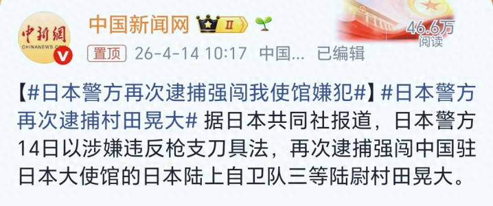 2026年4月14日,日本警方再次逮捕村田晃大,这个强闯中国驻日大使馆的嫌犯又一次参加世界视线。