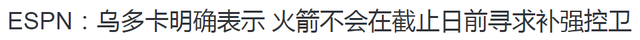 NBA中国官方网站转发了ESPN名记Michael C. Wright的爆料,乌度卡在接收采访时知晓了火箭里面的新决定。乌度卡告诉记者:火箭不会在来去界限日前引进控卫。