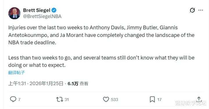 NBA记者Brett Siegel今天写说念:“最近两周,安东尼-戴维斯、吉米-巴特勒、字母哥和莫兰特接连受伤,澈底改动了NBA交往容貌。距离交往截止日还有不到两周,但许多球队仍然不知说念他们要作念什么,也不知说念接下来会发生什么。”