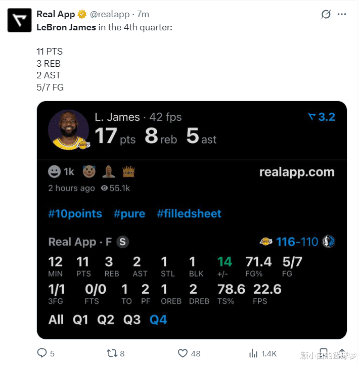 41岁的勒布朗才总揽攻防的存在,他在小节打满12分钟,湖东谈主从过期14分到反超他是见证者,湖东谈主在短短5分45秒里打出27-6,詹姆斯全程参与,防卫端抢断、盖帽、抑止敌手,首要端7中5+三分1中1拿到11分,莫得罚球的情况下,詹姆斯小节+14!