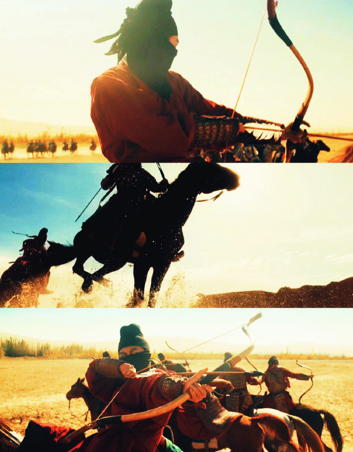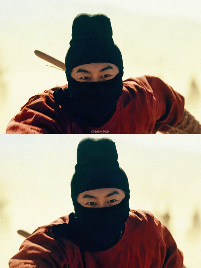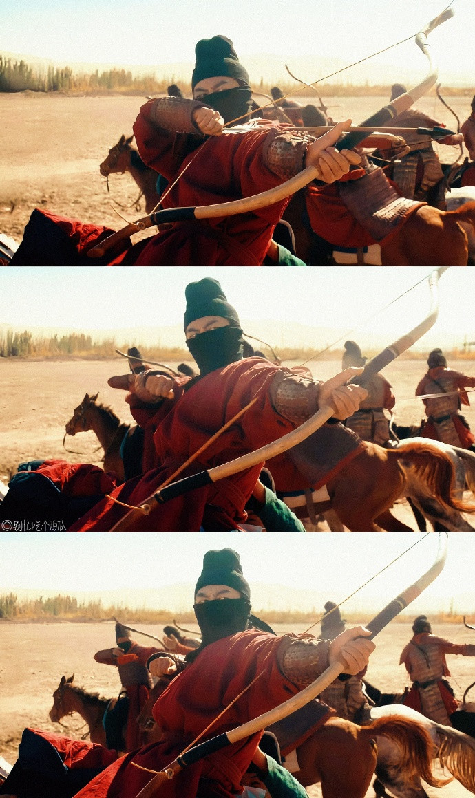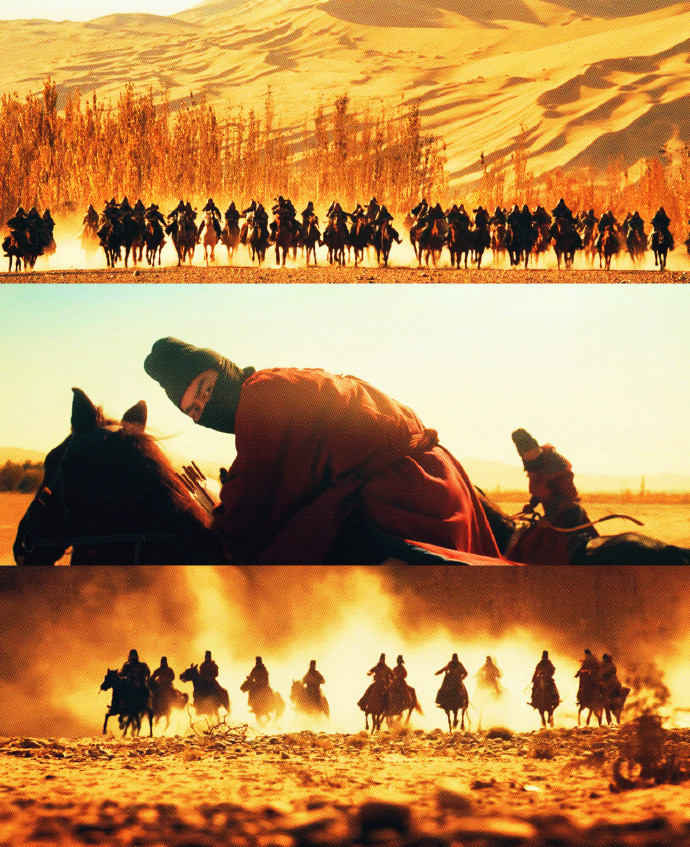 再看他在黄沙里合手枪冲锋的铁血,万马奔腾中骑马射箭更是形式壮志桀骜不恭,自带王者气场,朱亚文把雄主雏形的谋与勇描述很灵活。