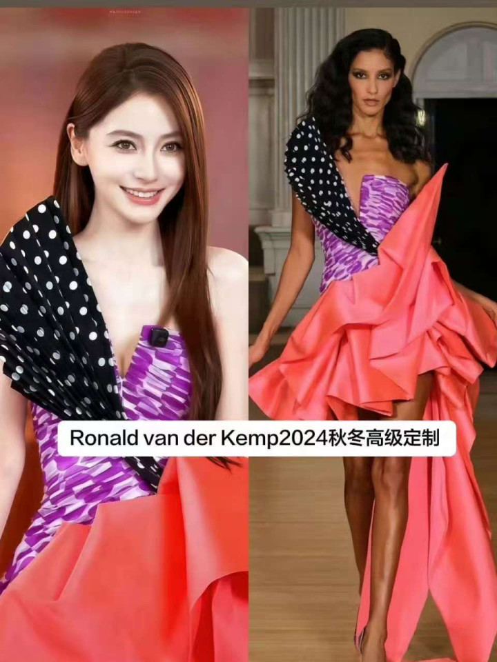 当镜头瞄准直播间的中心,Angelababy身着Ronald van der Kemp 2024秋冬高档定制裙装亮相的顷刻间,仿佛沿途集中往时与当今的时空裂隙被悄然大开。紫粉撞色的抹胸打算斗胆而明艳,因循波点肩带与珊瑚红层叠裙摆互相衬托,这不仅是颜色好意思学的得胜,更是一场对于“好意思”的无际宣言。当作与该品牌第八次联袂的高定互助,这套裙装不仅标志着个东说念主演绎高定总和突破140套的行业里程碑,更以一种近乎宣言的姿态,宣告了“内娱高定女王”地位的不成撼动。她站在那儿,自身便是一部行走的前锋史。