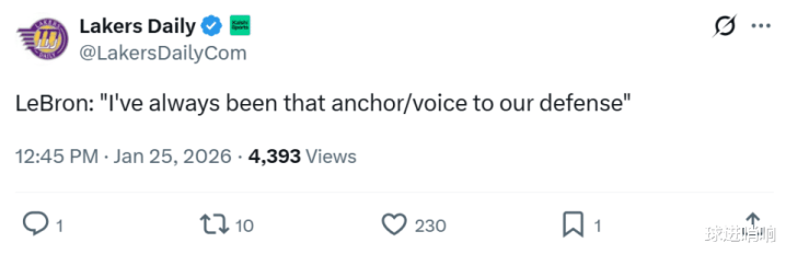 同期詹姆斯关于小节球队防卫端的强度升迁感到酣畅,同期直言:“夙昔几年,我一直是咱们防卫端的中枢,清静疏导与换取(I've always been that anchor/voice to our defense)。”