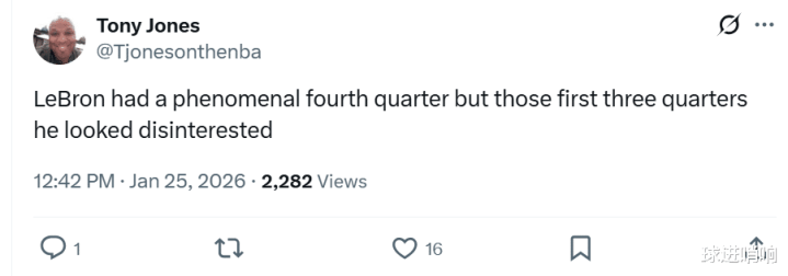 靠近詹姆斯这么的发达,记者Tony Jones赛后精确评价说念:“勒布朗在小节打出惊艳发达,但他在前三节看起来皆备提不起敬爱。”