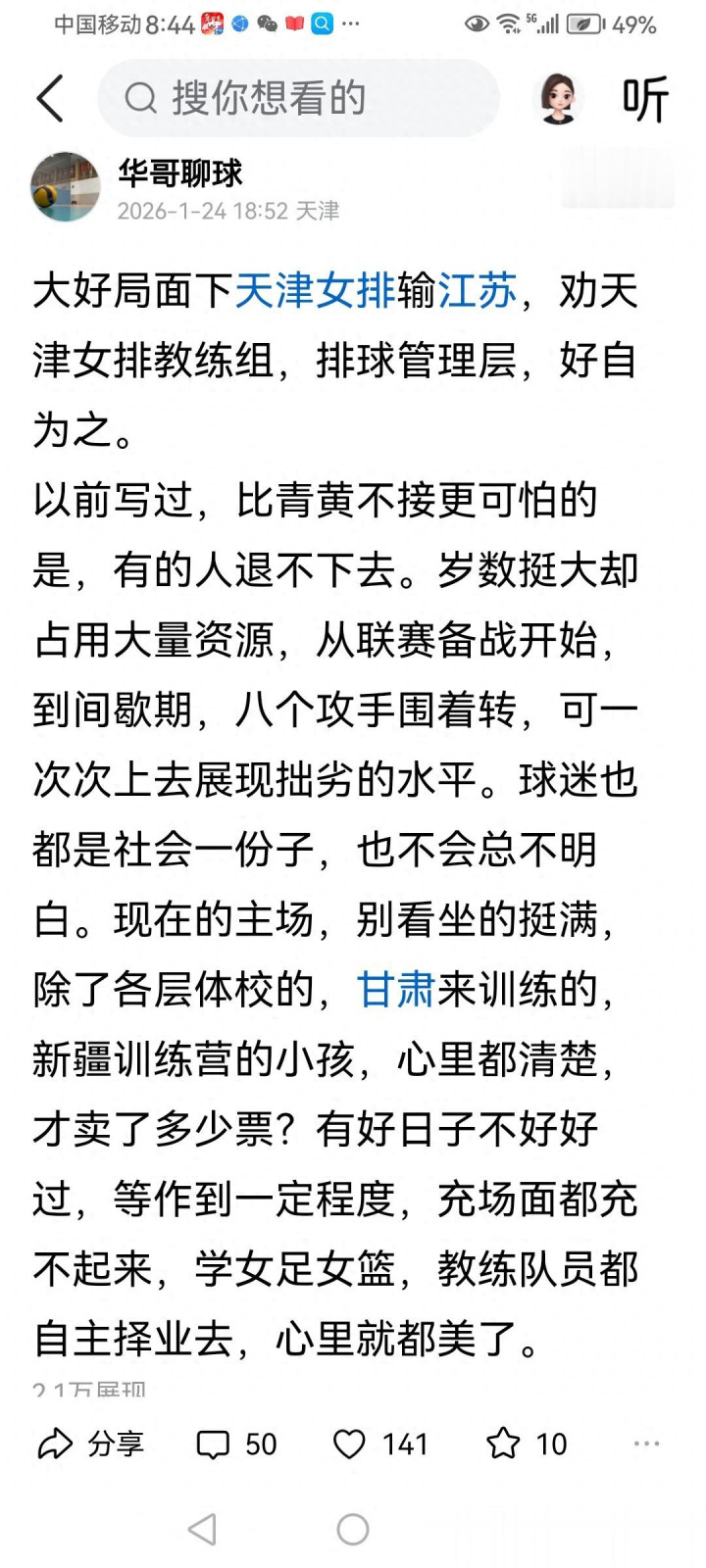 今天早上,看到自媒体“华哥聊球”对于昨天津苏女排大战的一篇著述,嗅觉竟然发自肺腑,爱之深责之切,一向文笔儒雅良善的华哥,在文中有点点小欣忭地谈到: