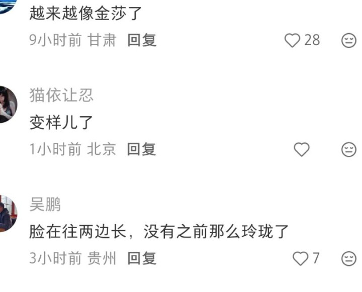 她的眼型、脸型也变了,酿成了细长的眼型,看着和莫文蔚、金莎等长脸女星相等相似,跟她昔日的气质全然不相像。