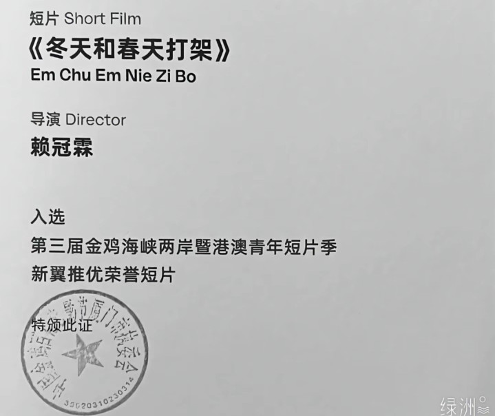 在更早的创作尝试中,他执导的公益短片《冬天和春天打架》获高傲大利罗马零丁电影奖6月“月度竞赛”最好导演等多个奖项,也入围该奖年度提名。